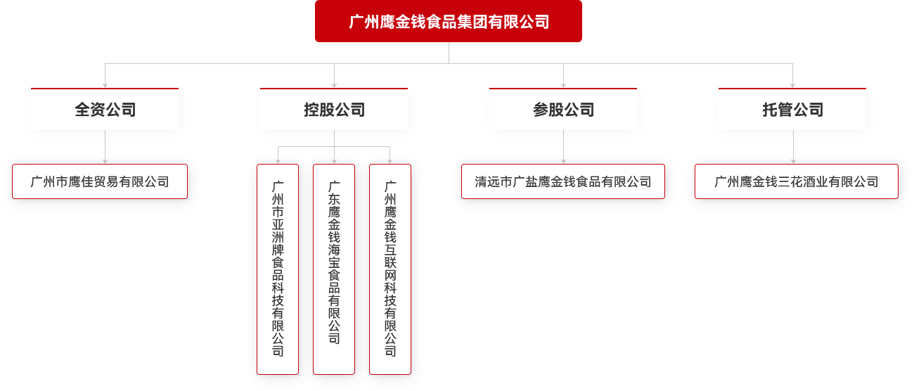 廣州鷹金錢食品集團有限公司,是廣州國有食品生產經營企業,前身為廣東罐頭廠,始建于1956年。目前,公司主要產品有罐頭食品、餅干、酒、生鮮冷鏈、飲料五大板塊。上世紀90年代末,在廣州輕工食品工業產品結構調整和可持續發展的方針指導下,廣州鷹金錢食品集團有限公司先后吸收兼并了廣州輕工屬下近10家食品生產企業。